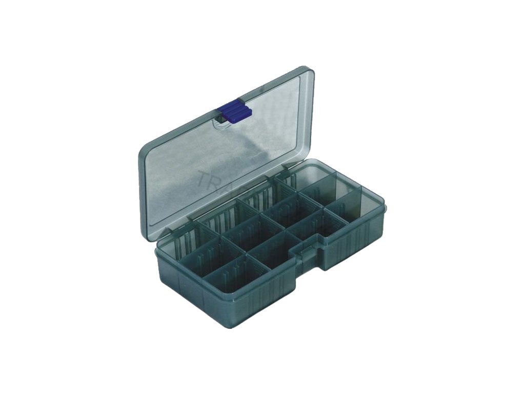 Plastová, jednostranná krabička na rybářské příslušenství.