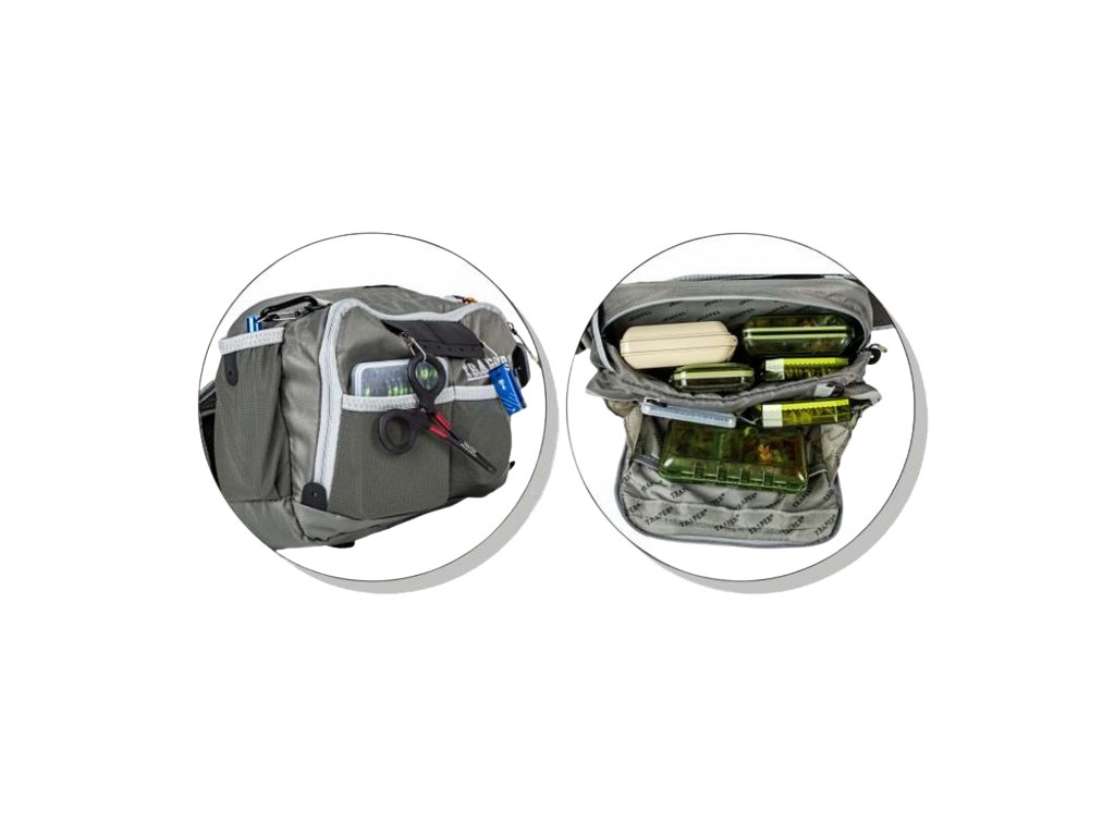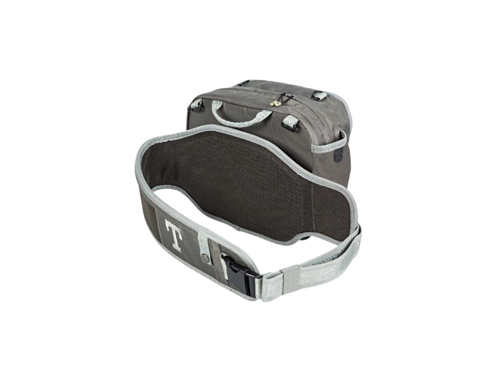 Kromě toho je ledvinka vybavena čtyřmi vnějšími pružnými kapsami, plastovými D-kroužky a gumovou lišta pro připevnění kleští.