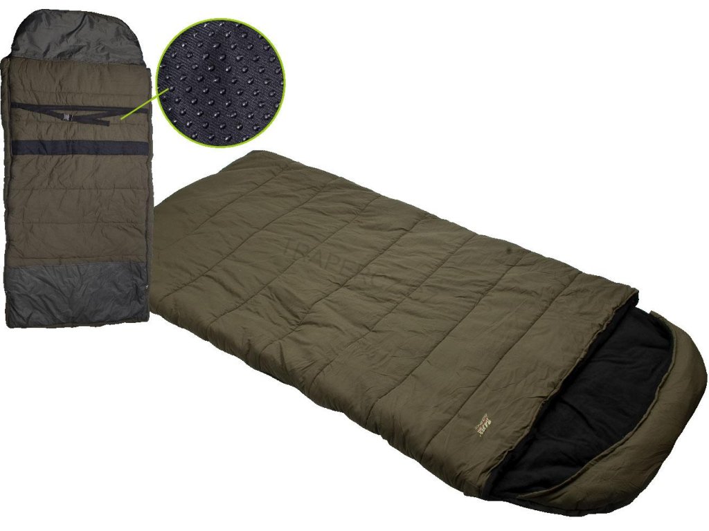 Zapínací pás a všitá protiskluzová páska zabraňují sklouznutí spacího pytle z lehátka.