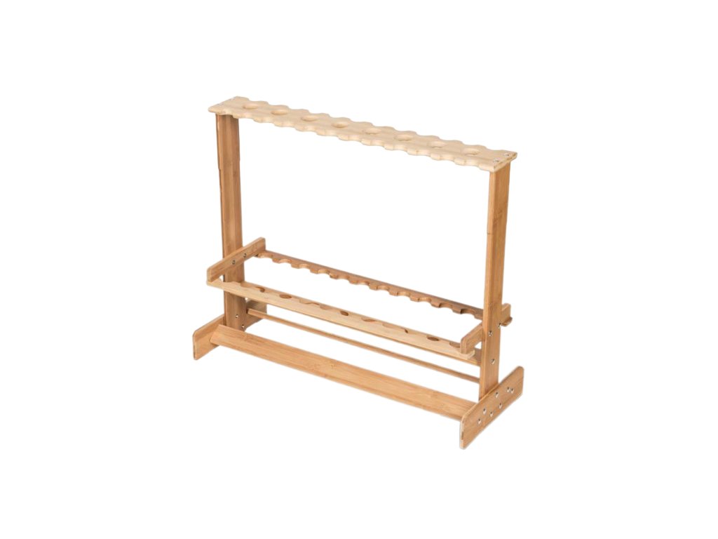 Kvalitně zpracovaný dřevěný stojan na pruty.