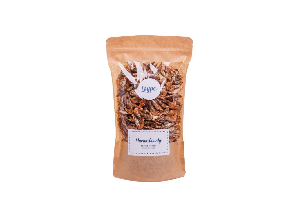 Marine Bounty jsou sušené krevety, které poskytují vysoký obsah bílkovin a níký obsah tuku. Díky tomu jsou vhodné i pro psy s citlivým zažíváním nebo na dietě. Křupavá textura a výrazná chuť moře z nich dělají atraktivní pamlsek pro trénink i běžné odměňování. Dostupné ve dvou velikostech balení: 30 g a 120 g.